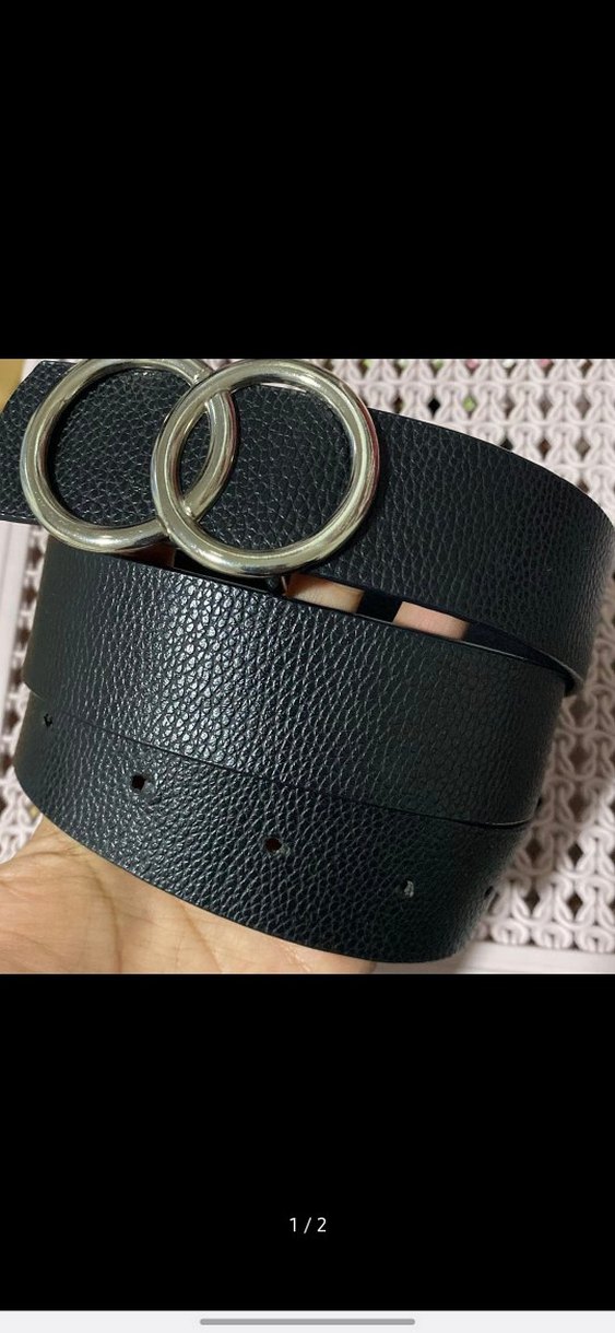 Dokulu yüzeye sahip çift halka tokalı siyah deri kadın kemer, trend sokak stili için uygun.