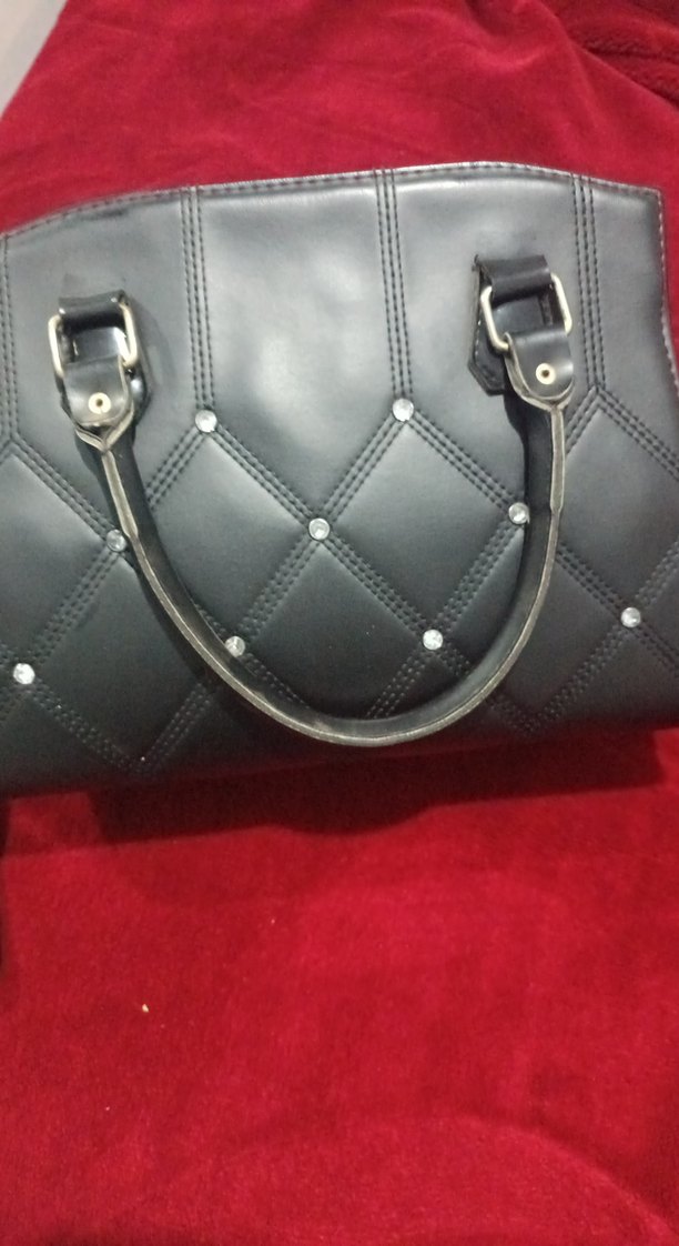 Siyah deri ve tokalı kayışlara sahip kadın çanta biker tarzı ve gotik etkiler taşır. Gri dikiş detaylarıyla dikkat çeker.