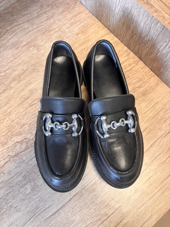 Parlak siyah deri kadın loafer, gümüş tokalı ve blok topuklu, ofis için şık ve trend bir seçim.