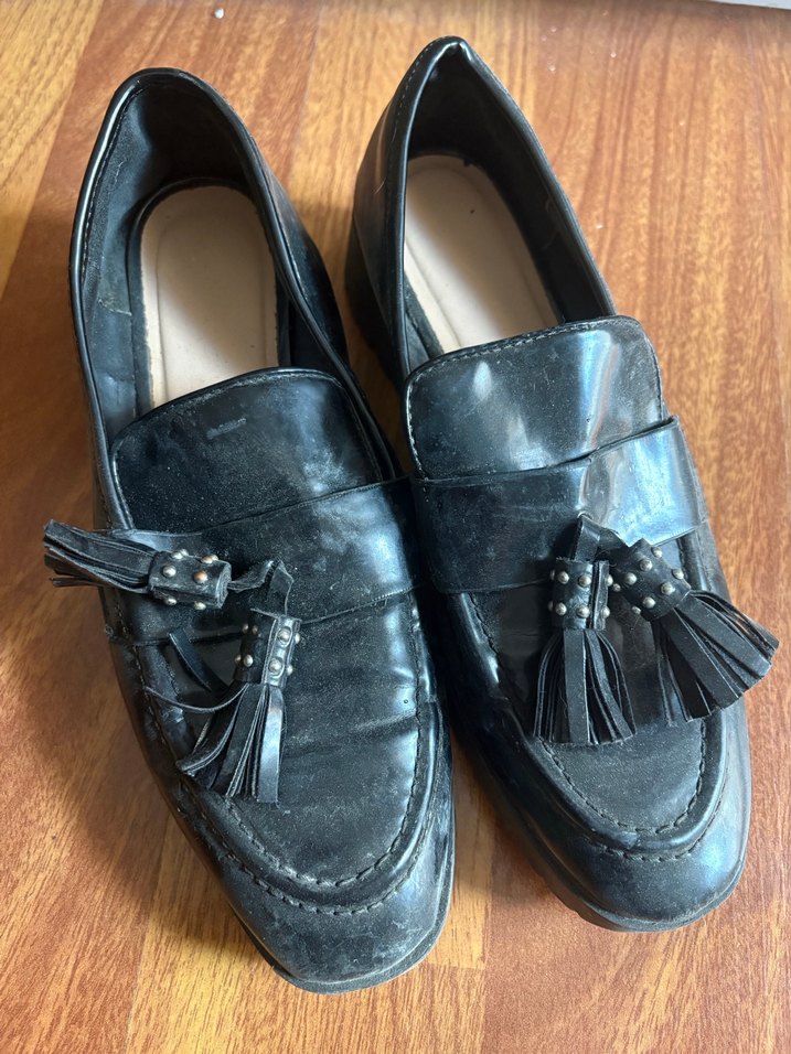 Siyah parlak deri, tokalı püsküllü kadın loafer, blok topuklu ve düz yüzeyli, ofis için uygun gotik tarzda. Orjinal zaradır. Ayakkabı tozlu. Fotoğraftaki gibi
