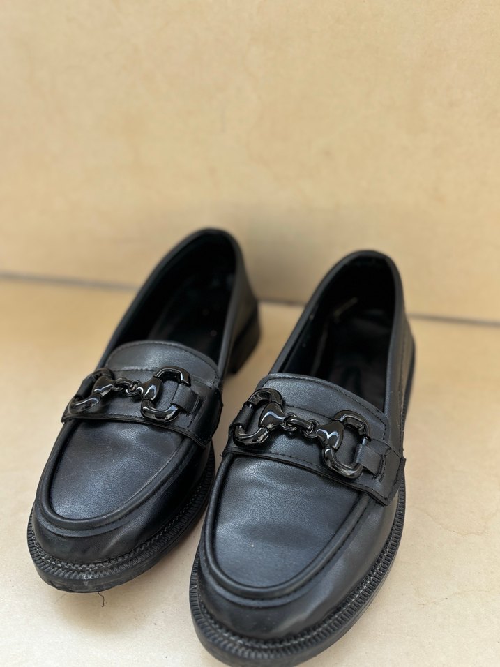 Siyah, blok topuklu kadın loafer. Tokalı detaylı. Ofis için uygun, trend gotik tarzında. Bir kere giydim tabanından da anlarsınız. İhtiyaç fazlası.