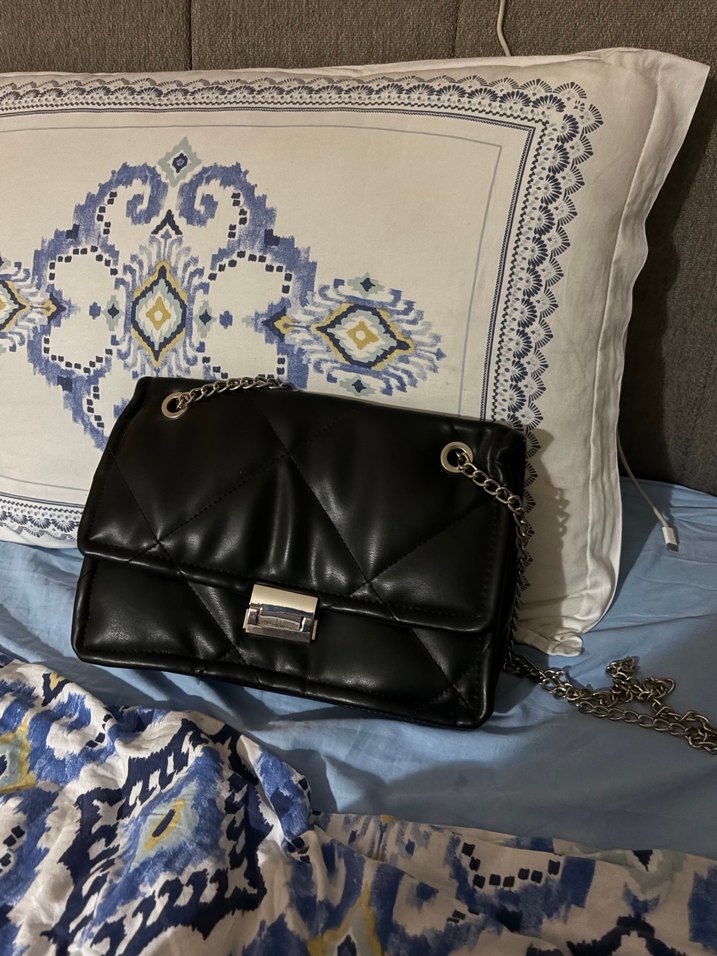 Siyah deri, tokalı ve zincir askılı kadın omuz çantası, desen içermeyen şık tasarıma sahip, gündelik şıklık için ideal.