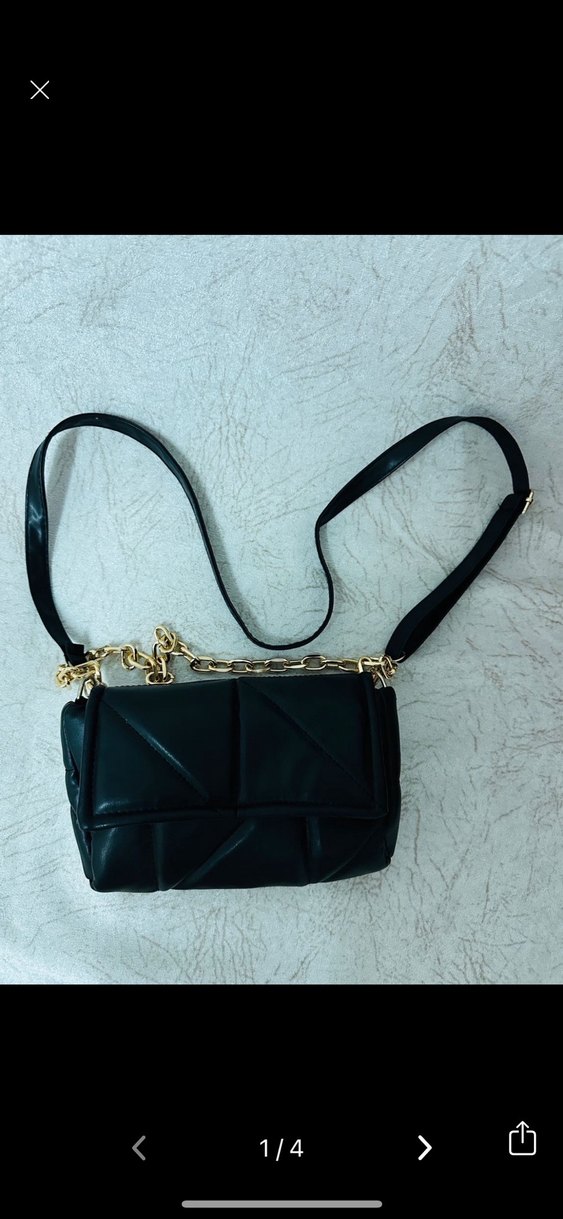 Siyah deri, tokalı ve zincir detaylı bu kadın omuz çantası, sokak modasına uygun şık ve desen içermeyen bir tasarıma sahiptir.