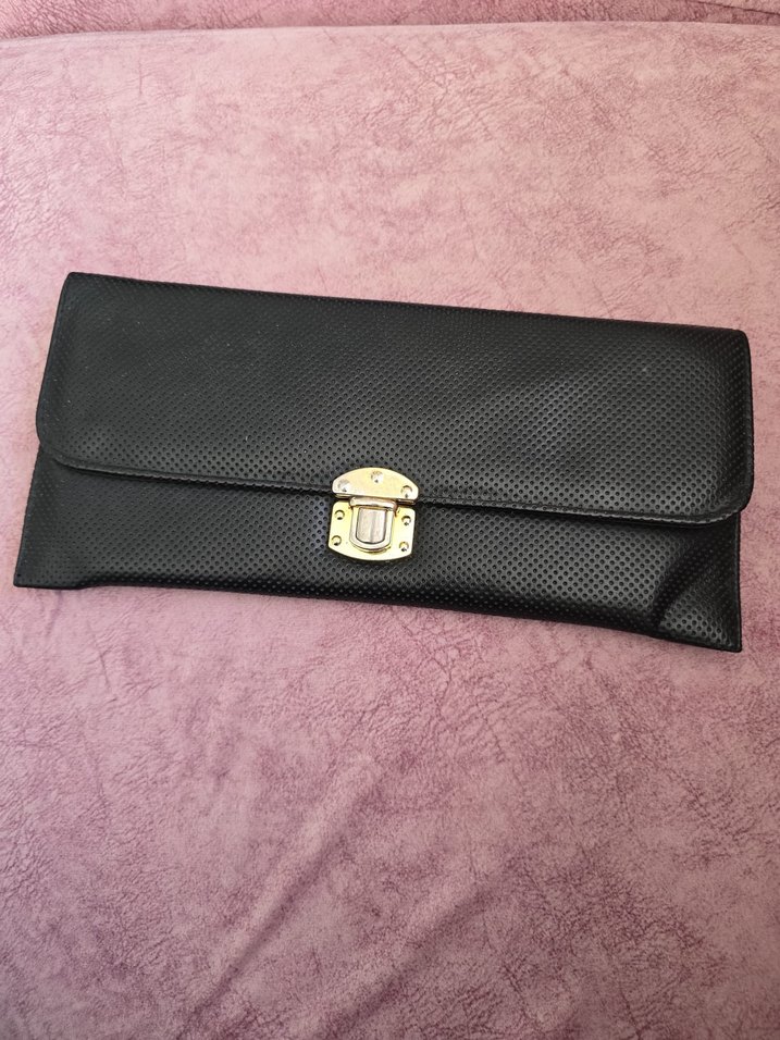 Siyah deri, tokalı kapaklı kadın portföy çanta, klasik ve gotik tarzda, ofis kullanımı için uygun. ✨