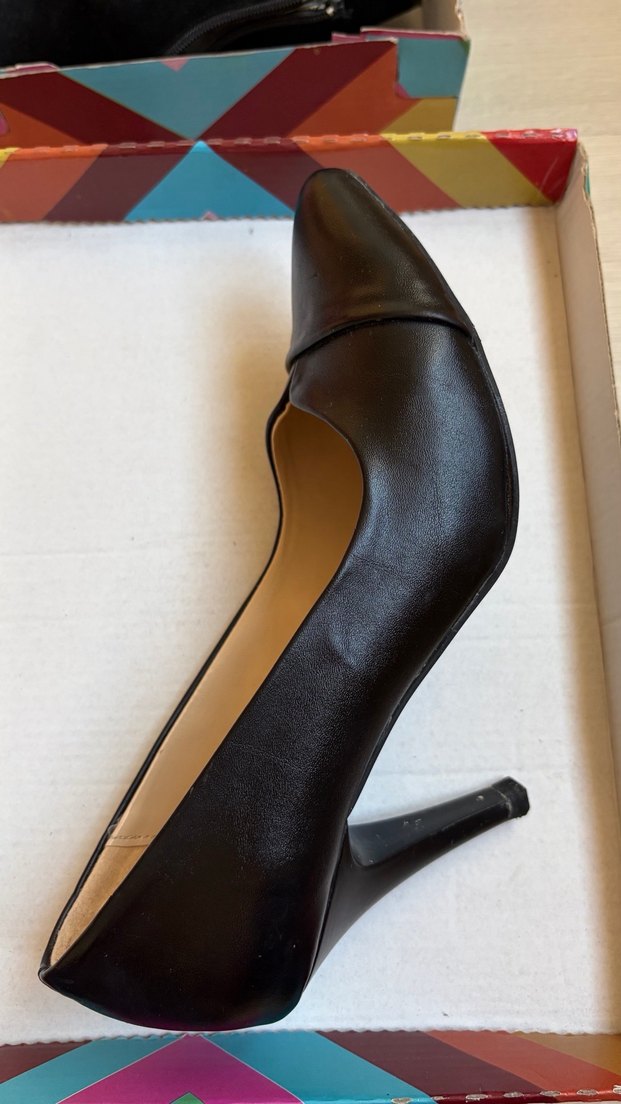 Ofis kullanımı için uygun, tokalı detaylı siyah deri stiletto. Klasik ve çağdaş tasarım sunar.