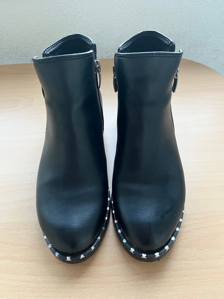 Siyah deri kadın botları, blok topuk ve tokalı detaylara sahiptir. Parlak yüzeyiyle günlük şıklık için uygundur 2 3 kez giyildi hic bir sorunu yok