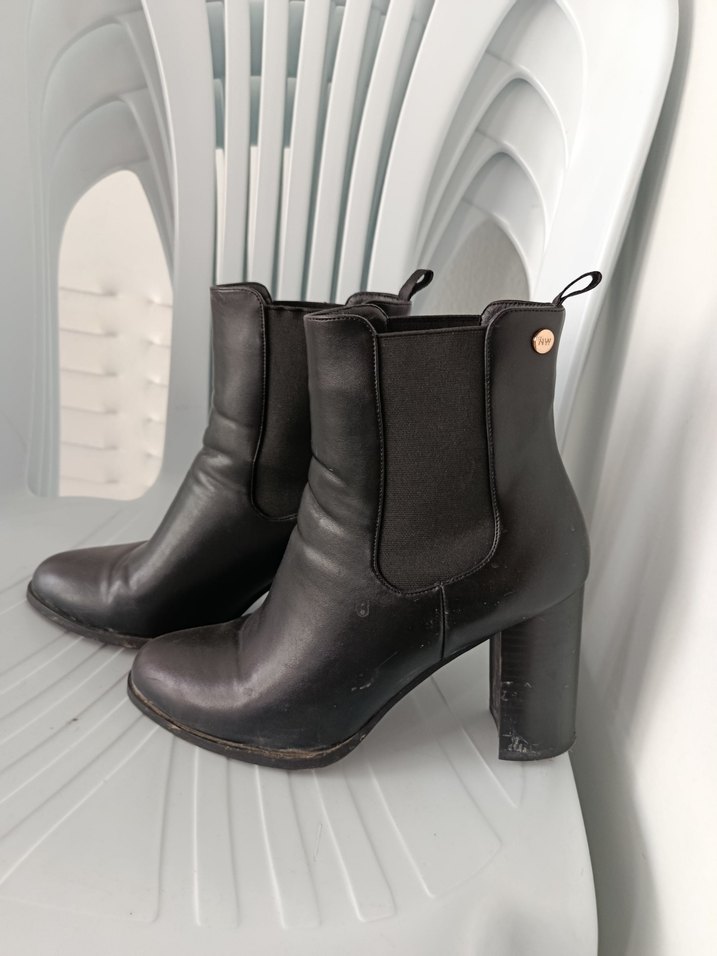 Siyah deri, tokalı kadın botları kalın topuklu ve desensiz tasarıma sahiptir. Günlük kullanıma uygun, trend goth tarzını yansıtır.
