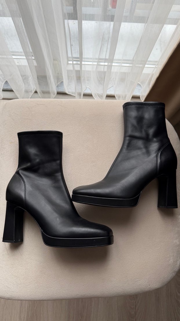 Stradivarius 39 numara yüksek blok topuklu Siyah deri, tokalı kadın botları. Bilek kısımlarında çok az soyulmalar vardır dışarıda hiç giyilmemiştir sadece kombin videolarında kullandım