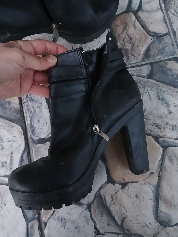 Siyah deri, tokalı ve yan fermuarlı kadın topuklu bot. Blok topuklu, günlük ve goth tarzlara uygun şık tasarım. boya istiyor sadece