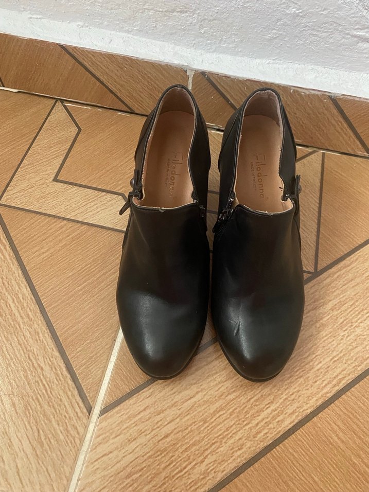 Siyah deri, tokalı ve kalın topuklu kadın botu. Desensiz tasarımı normcore stiline uygun, ofis kullanımı için ideal.