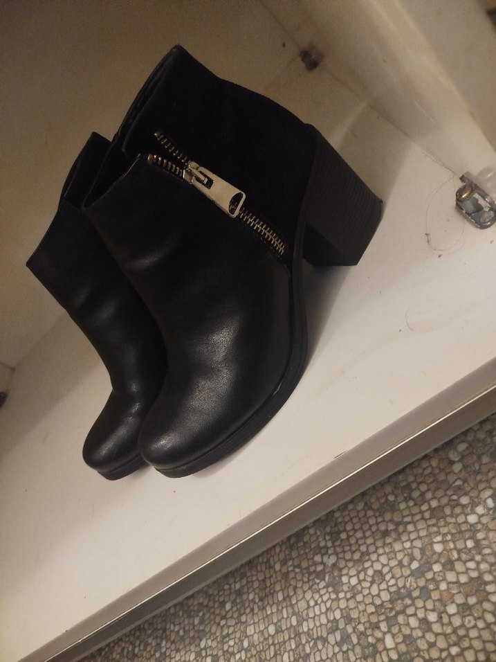 Siyah deri kadın botları, blok topuklu ve tokalı detaylara sahiptir. Minimalist goth tarzında, günlük kullanıma uygundur. Rahat ve trend görünümlü.