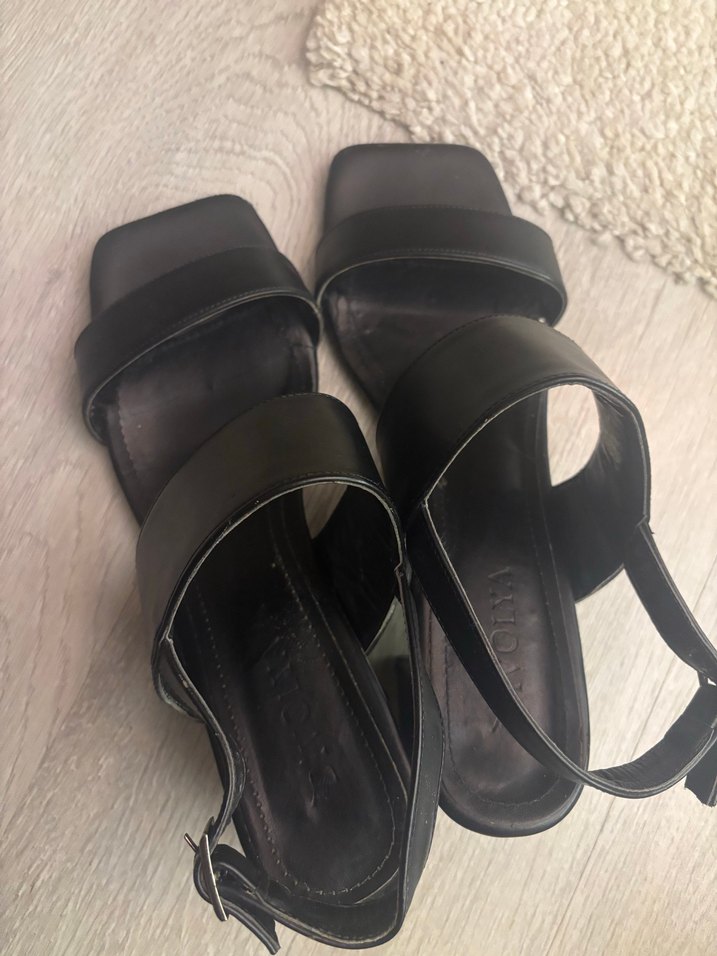 Siyah deri, tokalı kayışlı, blok topuklu kadın sandalet. Minimalist ve gotik tarzda, günlük kullanım için uygundur. Bantları sağlamdır, görsel ile uyumludur