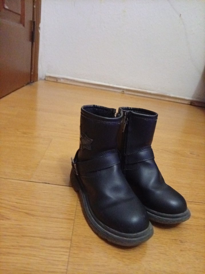 Siyah deri, tokalı ve fermuarlı kız çocuk biker botları. Koyu renkli ve desensiz tasarıma sahip, rock punk havası veren sağlam tabanlı botlar.