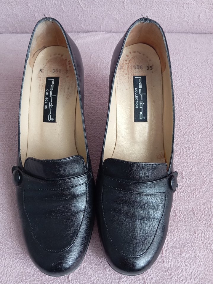 Siyah deri, tokalı, blok topuklu klasik kadın ayakkabısı. Ofis için uygun, normcore tarzda şık bir seçim.