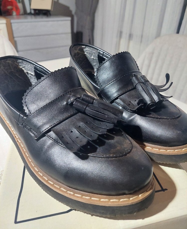 siyah deri tokalı ve püsküllü loafer ayakkabı, gotik tarzda, rahat ve dayanıklı.