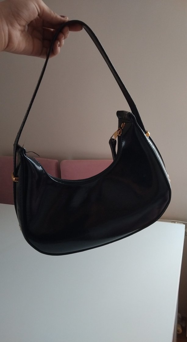 Siyah deriden yapılmış, tokalı ve minimalist gotik tarzda kadın çantasıdır. Düz yüzeyli ve günlük kullanım için uygundur.