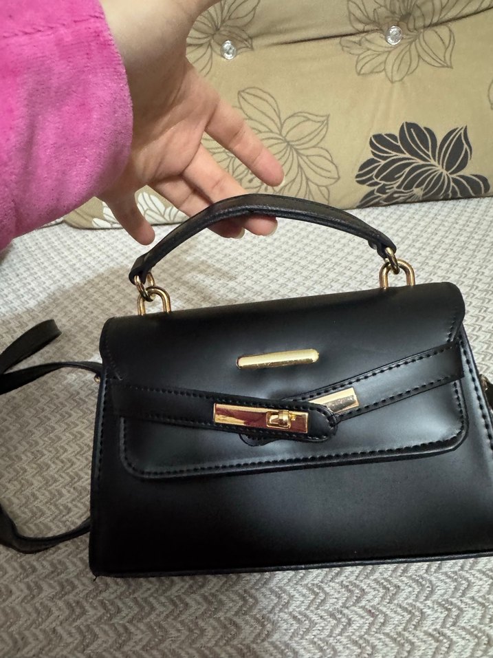 Siyah deri, tokalı ön detaylı kadın çantası. Modern klasik tarzıyla günlük kullanıma uygun, üst tutma saplı ve desensiz tasarım.