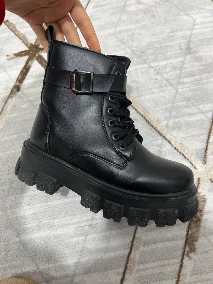 Siyah deri, tokalı ve bağcıklı platform topuklu botlar, trend sokak stiline uygun şık ve rahat bir seçenektir.