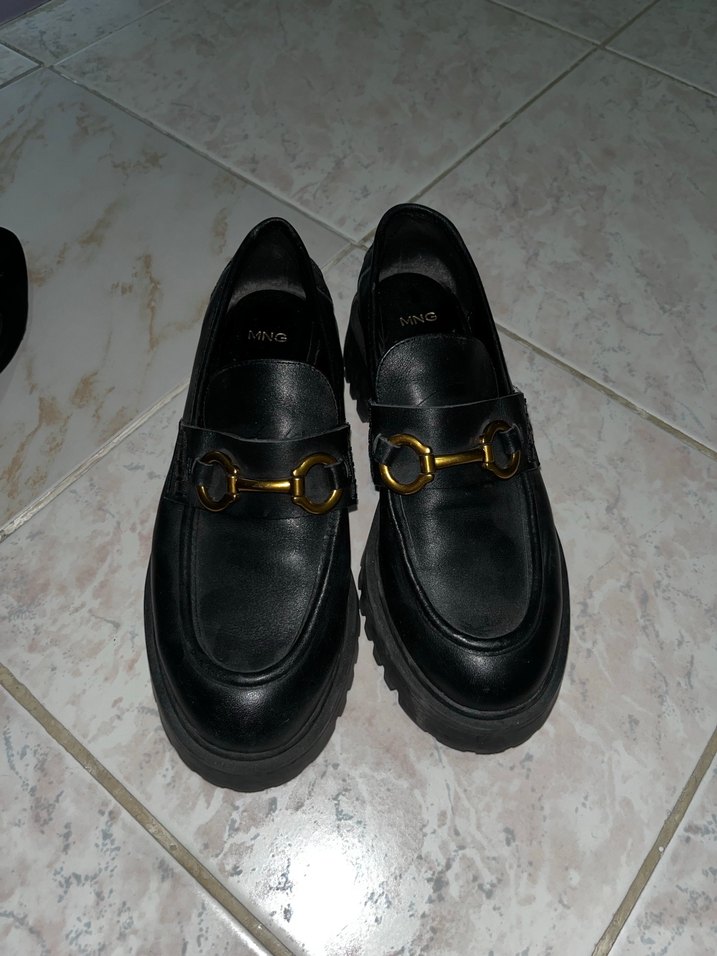 Siyah deri, tokalı ve platform topuklu kadın loafer. Klasik goth tarzında, ofis kullanımı için uygun. Sıfır sayılır. 1 kez giyildi tertemiz orijinal mangonun ürünü 37 numara ayakkabı