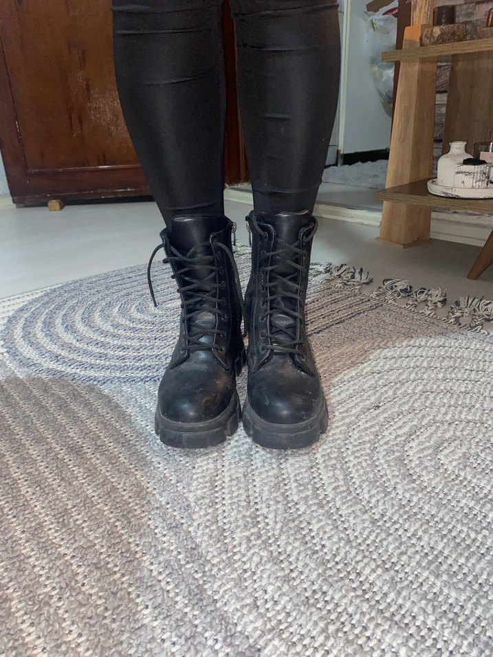 Siyah deri, tokalı goth botlar, kalın topuklu ve desen içermeyen tasarımıyla günlük kullanıma uygun rock punk havası taşır.