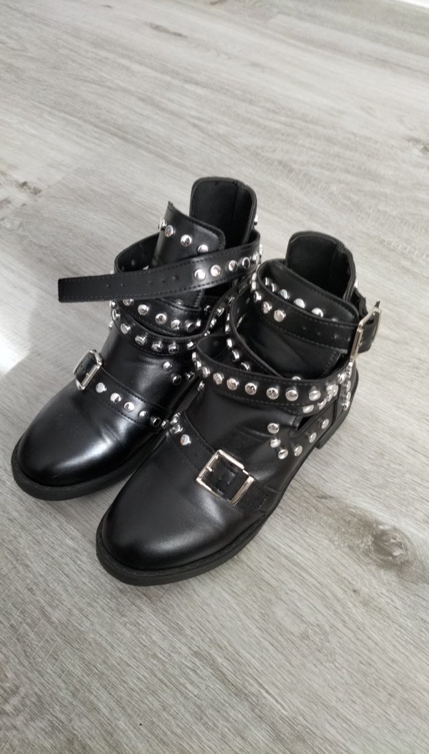 Tokalı kayışlar ve metal detaylar içeren siyah deri botlar, kalın topuklu. Goth ve grunge punk tarzıyla günlük kullanıma uygun.