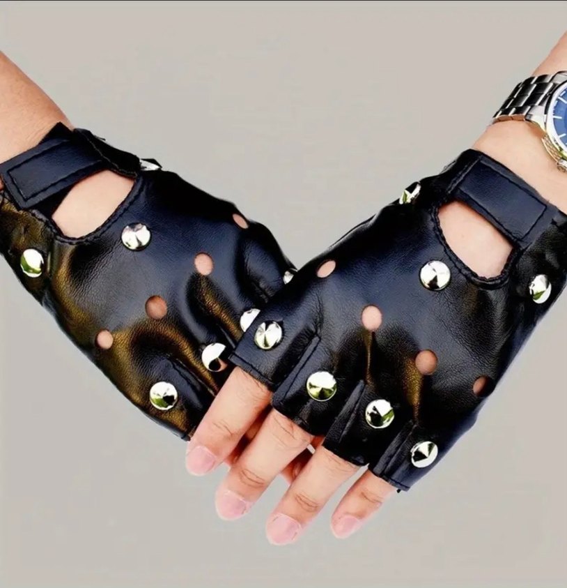 Renkli tokalar ve delikli tasarımlı siyah deri parmakları açık eldivenler, rock punk tarzı için uygun.