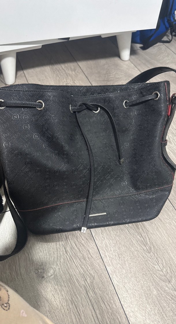Siyah deri, tokalı ve desenli kadın çantası, sokak stiline uygun, günlük kullanıma elverişli. Orijinal Vakkodur
