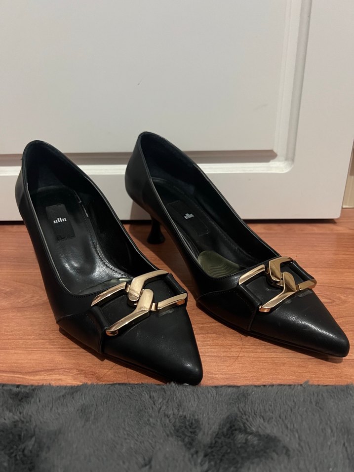 Yılan desenli siyah deri stilettolar, altın tokalı ve sivri burunlu, ince topuklu modern klasik tarzda.