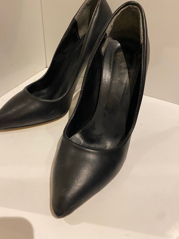 Siyah deri stilettolar, sivri burunlu ve klasik goth tarzıyla özel günler ve ofis kullanımı için uygundur.