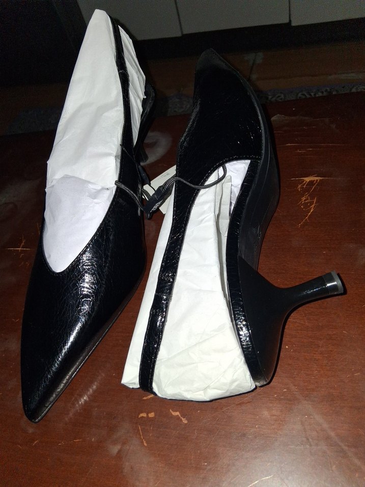 Siyah deri tokalı kadın stiletto ayakkabılar, şık sivri burun ve zarif topuklu tasarımla. Ofis için uygun, modaya uygun goth tarzı.
