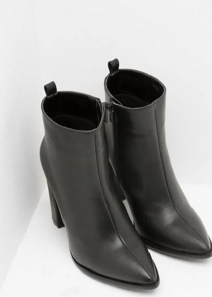 Siyah deri, tokalı ve stiletto topuklu kadın botları. Minimalist ve gotik tarzda, cesur günlük kullanıma uygun.