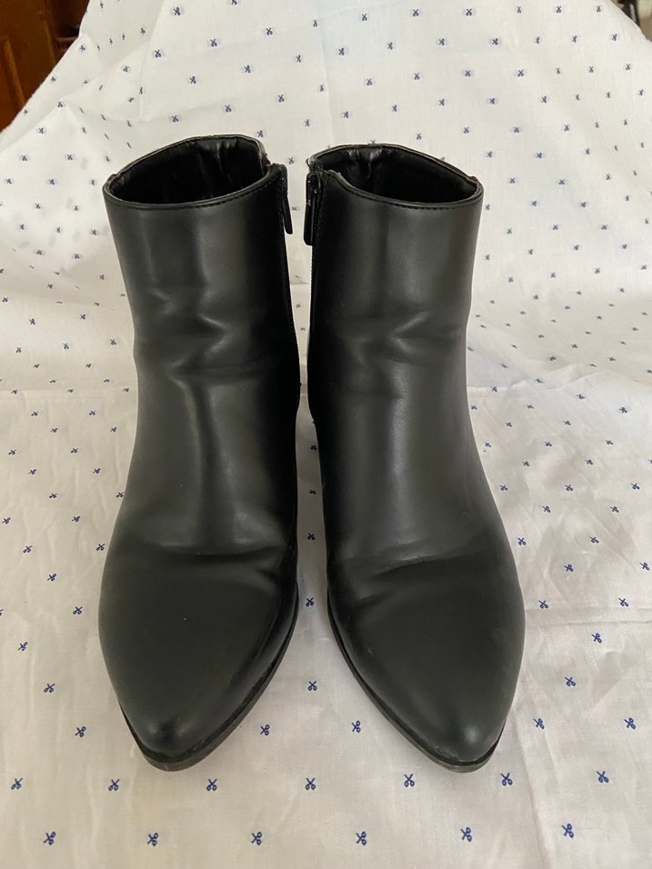 Siyah deri kadın bot, stiletto topuklu ve tokalı detaylı. Minimalist goth tarzında, günlük kullanıma uygun sade tasarım.