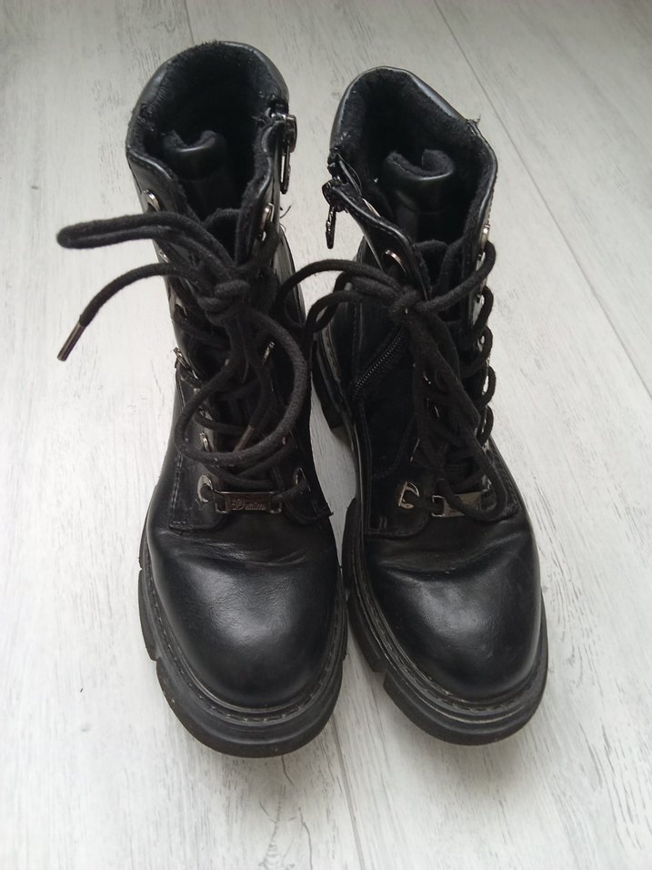 Siyah deri, tokalı ve stiletto topuklu kadın botları, günlük kullanıma uygun grunge punk tarzıyla uyumlu.