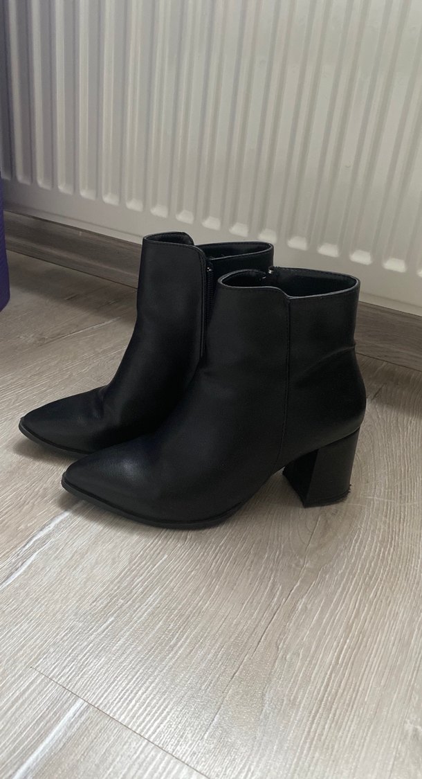 Siyah deri, tokalı ve kalın topuklu botlar, minimalist goth tarzıyla günlük kullanıma uygundur.