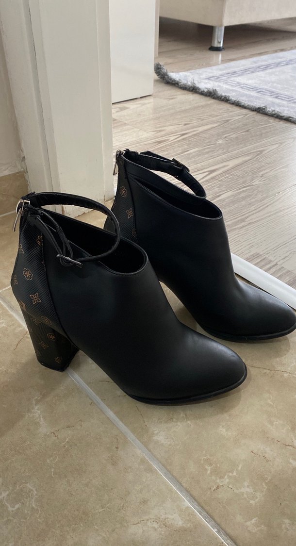 Siyah deri kadın botları, topuklu ve tokalı kayışlıdır. Arkasında hafif yılan derisi desenli. Günlük ve şık rahat kullanıma uygundur.