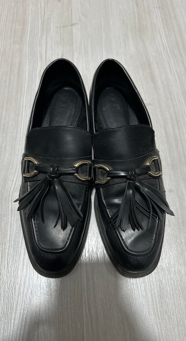 Siyah deri, tokalı püskül detaylı, blok topuklu kadın loafer ayakkabı, ofis için şık ve rahat.