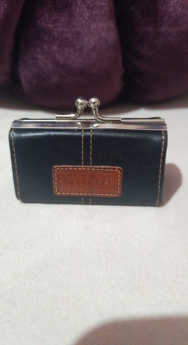 Siyah deri, tokalı kapama ve baskılı detaylara sahip vintage tarzda kadın cüzdanı. Günlük kullanıma uygundur.