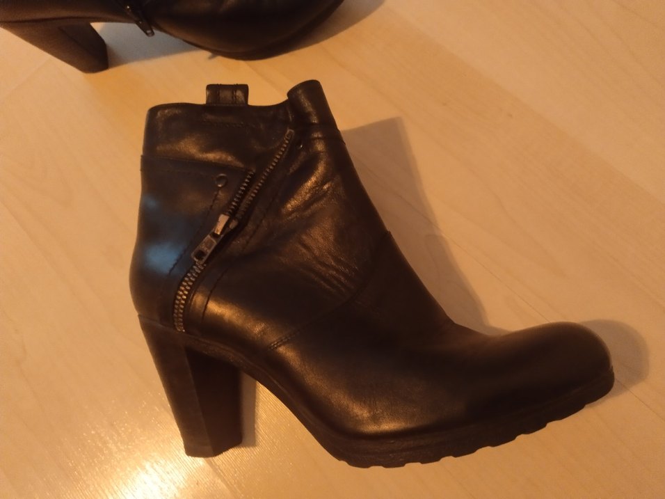 Siyah deri kadın botları, yüksek topuk ve yan fermuar ile tokalı detaylara sahiptir. Cesur, klasik gotik tarzı günlük kullanım için uygundur.