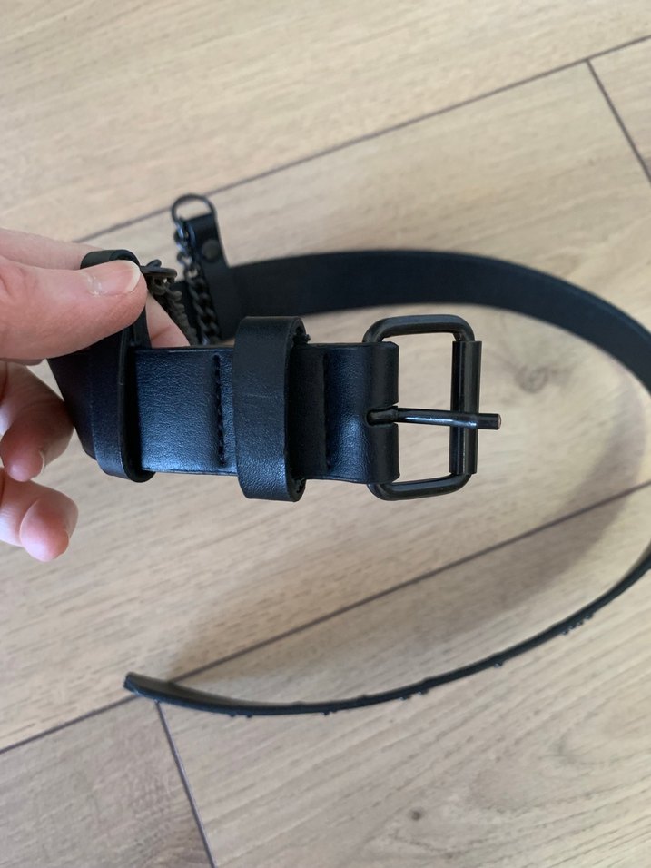 Bu çocuk kemeri, siyah deri kayış ve tokalı kapanışa sahiptir. Gotik ve punk rock havası taşır, koyu renk grunge tarzıyla uyumludur. Zincirli olmasa çocukların ilgisini çekiyor çok iyi durumda sadece iki kez kullanıldı