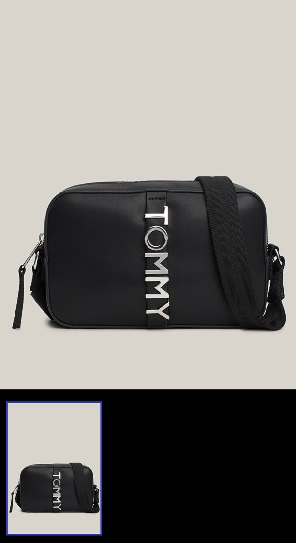 Siyah deri, kemerli tasarıma ve TOMMY logosuna sahip kadın çapraz çanta. Günlük sokak stili için minimal ve şık.