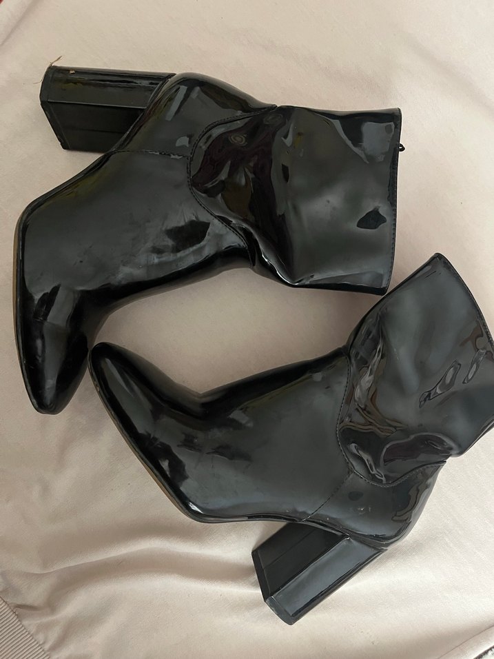 Siyah deri, yılan desenli ve tokalı detaylara sahip blok topuklu botlar. Cesur gotik stil, günlük kullanıma uygun.