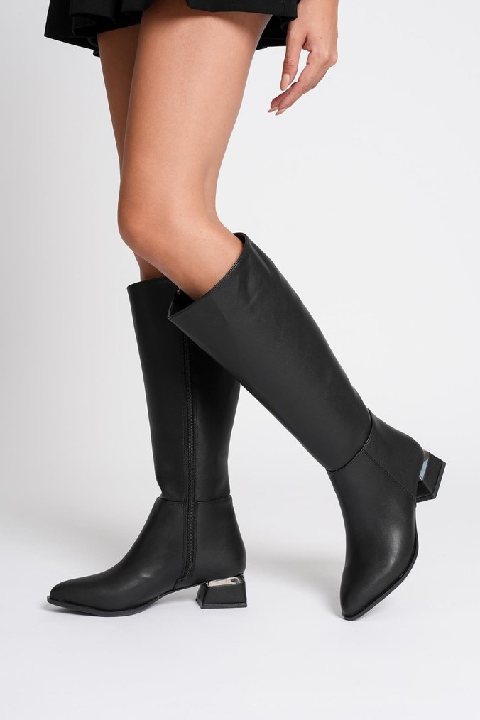 Siyah deri dizüstü çizme, blok topuklu, gündelik kullanım için çağdaş ve zahmetsiz şıklık sunar. Trend sokak stiline uygundur. #kadın #çizme