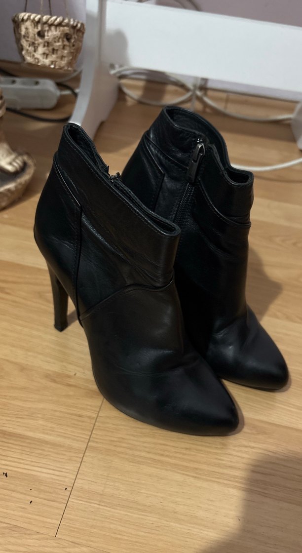 Siyah deri stiletto topuklu botlar, gotik tarzda cesur bir görünüm için romantik randevulara uygun.