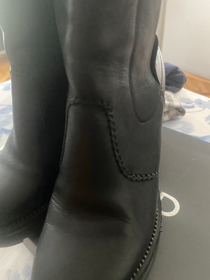 Siyah deri, topuklu kadın botu, günlük kullanıma uygun gotik tarzda şık bir görünüme sahiptir. Kaliteli bir deri. Bir kez giyilmiş olup tertemizdir