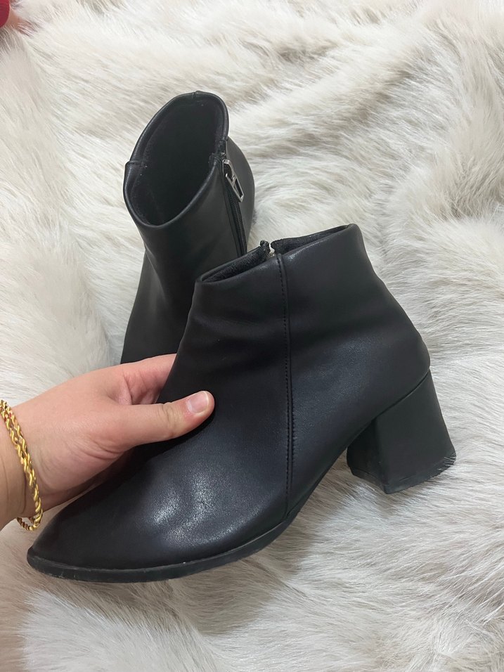 Siyah deri, blok topuklu kadın botları,minimalist gotik tarzda, günlük kullanıma uygun.