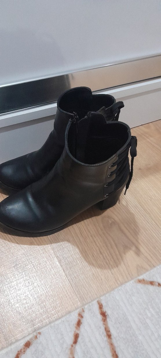 Siyah deri, ve blok topuklu goth tarzı kadın botu. Günlük kullanıma uygun, trend casual görünüme sahip.