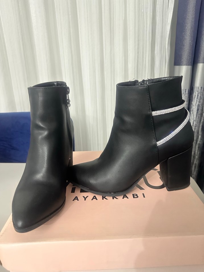 Siyah deri, tok topuklu kadın botları, tokalı detaylı. 1 kez giyildi sorunsuz marka temsili