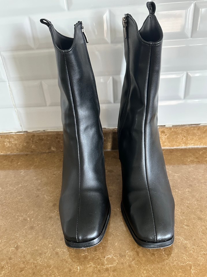 Siyah deri, ince topuklu ve tokalı kadın botları, minimalist ve gotik tarzda, ofis kullanımı için uygun.