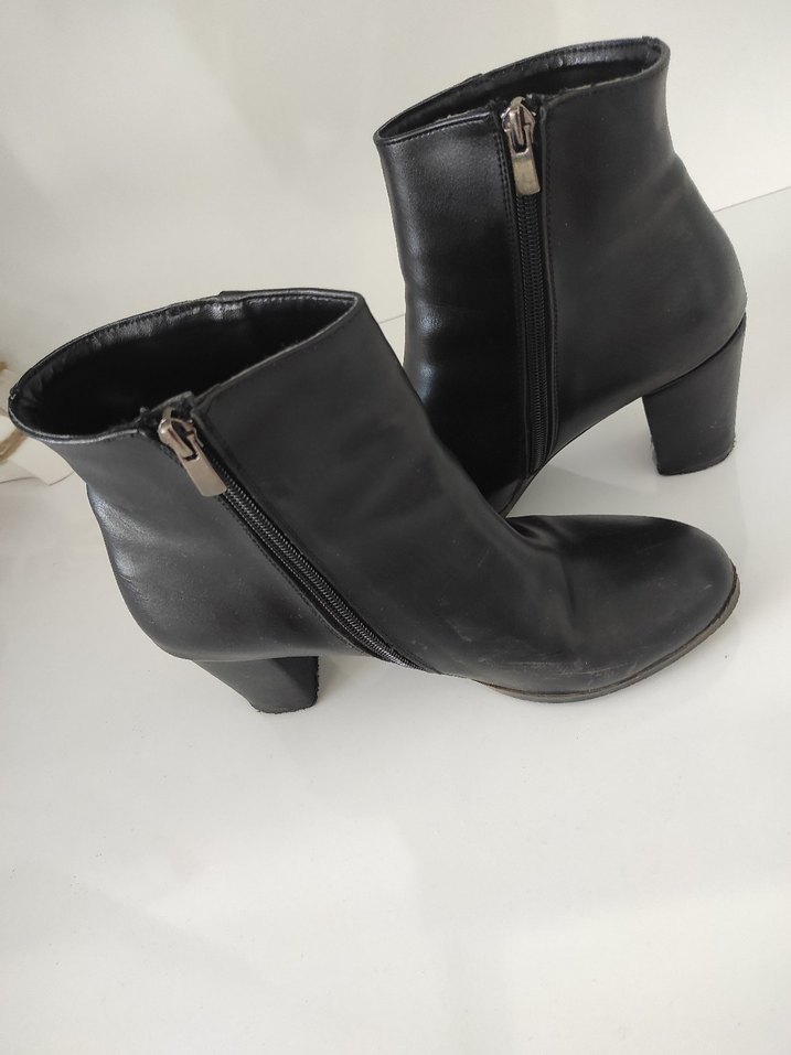 Siyah deri, blok topuklu kadın botlar, yan fermuar detaylı, minimalist gotik tarzda, ofis kullanımı için uygun.
