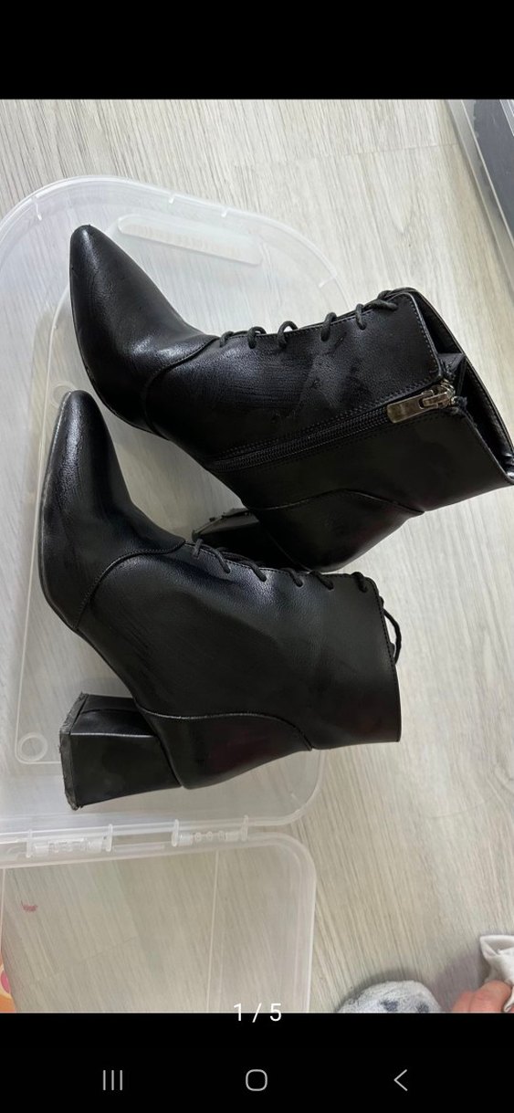 Siyah deri, blok topuklu, bağcıklı ve fermuarlı gotik kadın botu, günlük kullanım için uygundur.